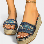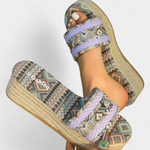Estilo libre con un guiño artesanal. Las sandalias Dorotea combinan una suela tipo yute con tejido étnico multicolor que añade vida y personalidad a cada paso. Ligeras, cómodas y llenas de carácter para acompañarte todo el verano.