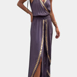 • Espalda descubierta con aberturas y ribetes dorados para un toque especial
