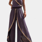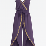 El mono Donatila destaca por su mezcla única de elegancia relajada y detalles artesanales. Con cuello cruzado, espalda descubierta y aberturas decoradas con bordes dorados, aporta un aire fresco y sofisticado a cualquier ocasión. Su cintura elástica y silueta holgada aseguran libertad de movimiento sin sacrificar estilo.